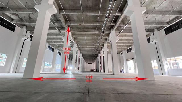 厂房均为1-3层,1楼10米高,2楼6/8米高,3楼6米高。柱间距8*10米,长度160米,宽度30米。